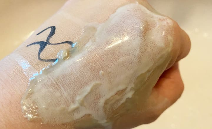 写真に撮っても境目がはっきりわかるぐらいに濃厚なとろみ。肌にのせるとやわらかく、心地よいテクスチャです。