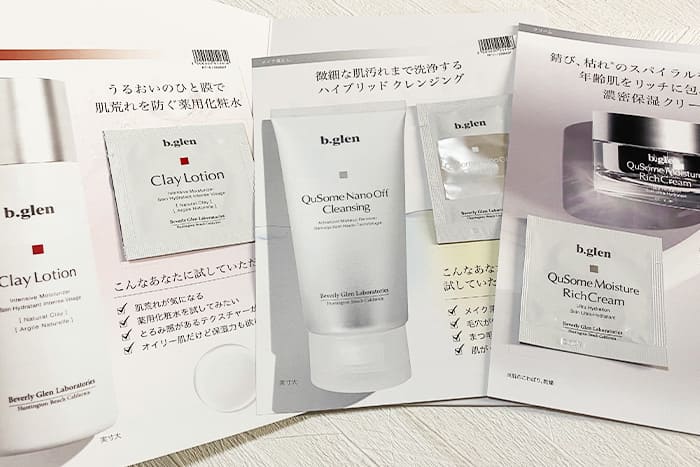 私がトライアルセットを頼んだ時には、トライアルセット以外にもb.glenこだわりスキンケアのサンプルが入っていて大満足でした。